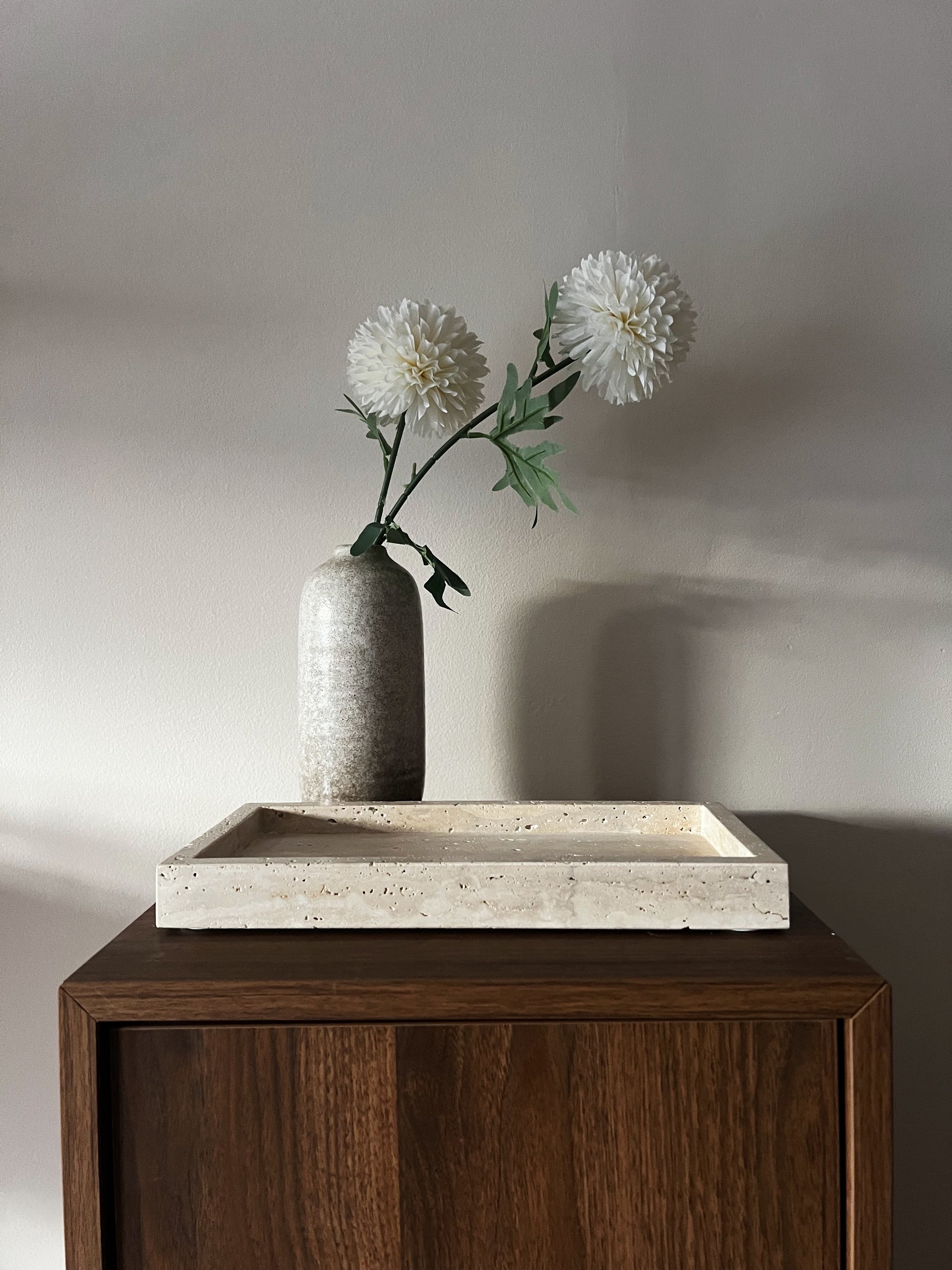 Le plateau PURE sculpté dans un travertin beige aux nuances douces et irrégulières, allie authenticité et élégance intemporelle.